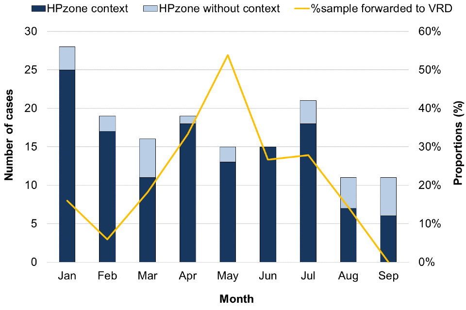 Figure 2. January to September 2020 cases entered onto HPZone dashboard. The line graph (right axis) shows the proportion of HPZone context cases that had a sample forwarded to the VRD