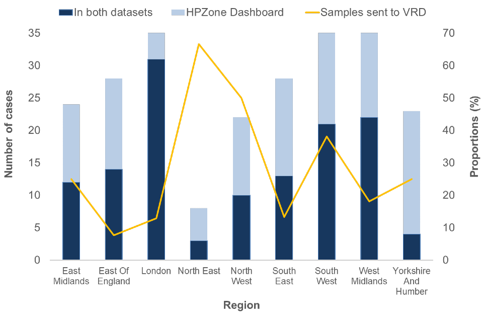 Figure 3. January to September 2020 cases entered onto HPZone Context and/or entered onto HPZone dashboard by UKHSA regions. The line graph (right axis) shows the proportion of HPZone context cases that had a sample forwarded to the VRD