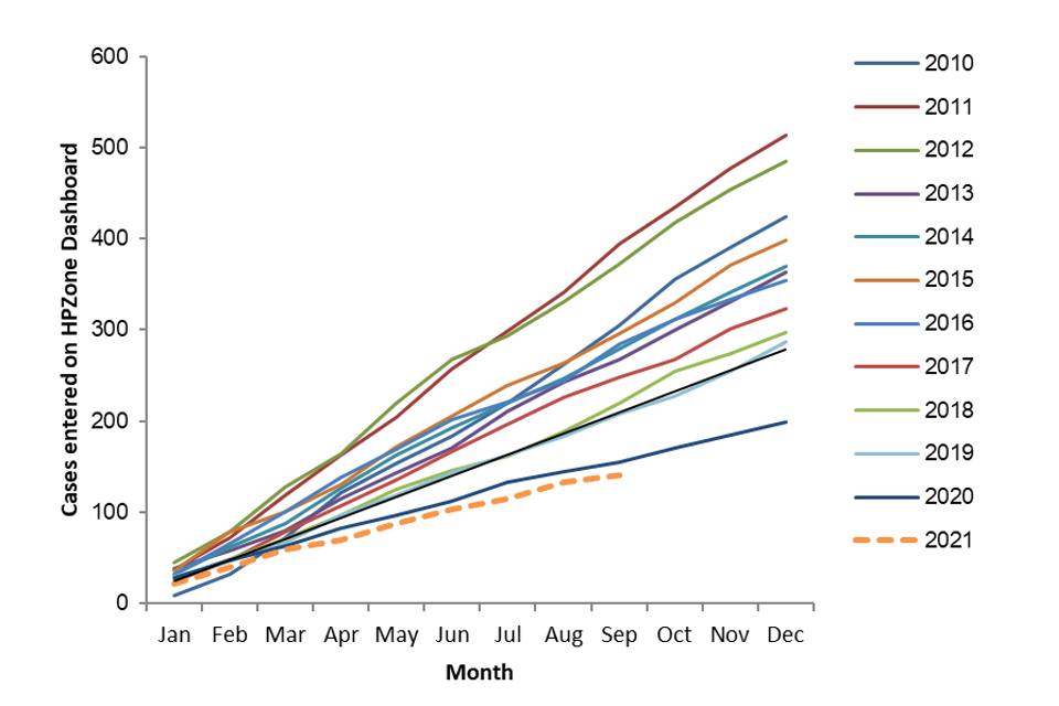 Figure 1. Cumulative cases of acute hepatitis B in England entered on HPZone Dashboard: 2010 to September 2021. (Note: 2021 data is provisional)