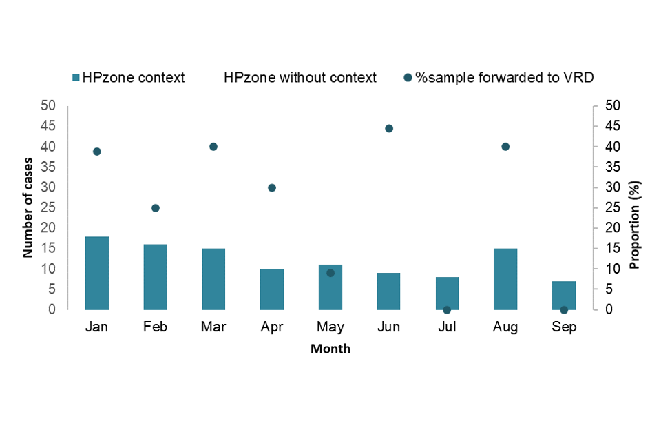 Figure 2. January to September 2021 cases entered onto HPZone Dashboard. The dots (right axis) show the proportion of HPZone Context cases that had a sample forwarded to VRD