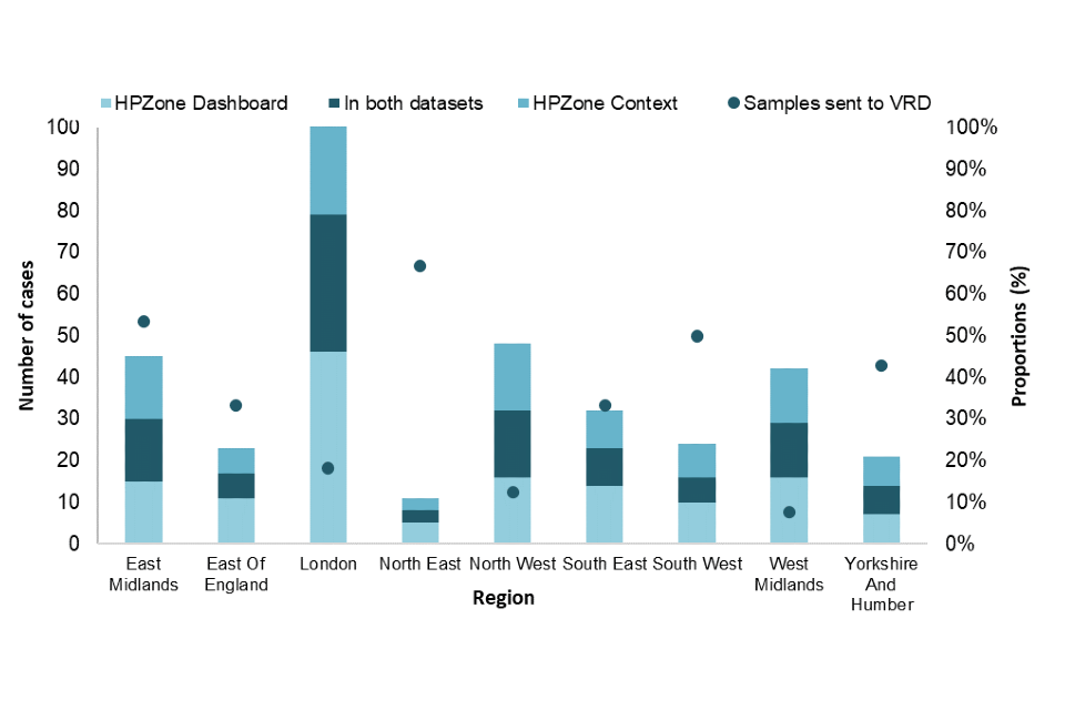 Not all cases with samples forwarded to VRD could be matched to cases in HPZone Context; this could either be due to a case not being entered on HPZone or it could be due to the case being entered in a previous quarter.