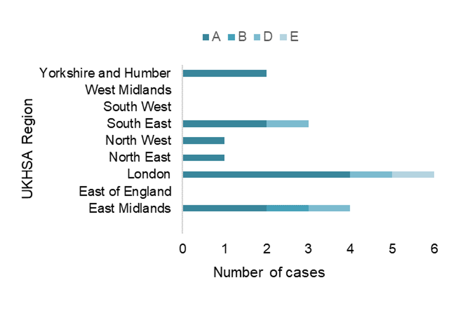 A total of 14 confirmed acute cases could be genotyped during the January to September 2021 quarter; the distribution of genotypes is shown in table 2. Consistent with trends seen in 2019 and 2020, genotype A was the most commonly reported genotype with 64% of cases (2). Additional sub genotype analysis of the A viruses indicated 89% to be A2. The distribution of genotypes seen in UKHSA regions is shown in figure 4.