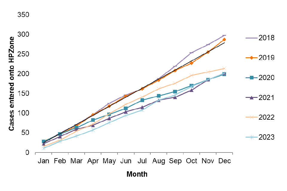 Figure 1. Cumulative cases of acute hepatitis B in England entered on HPZone: 2018 to December 2023