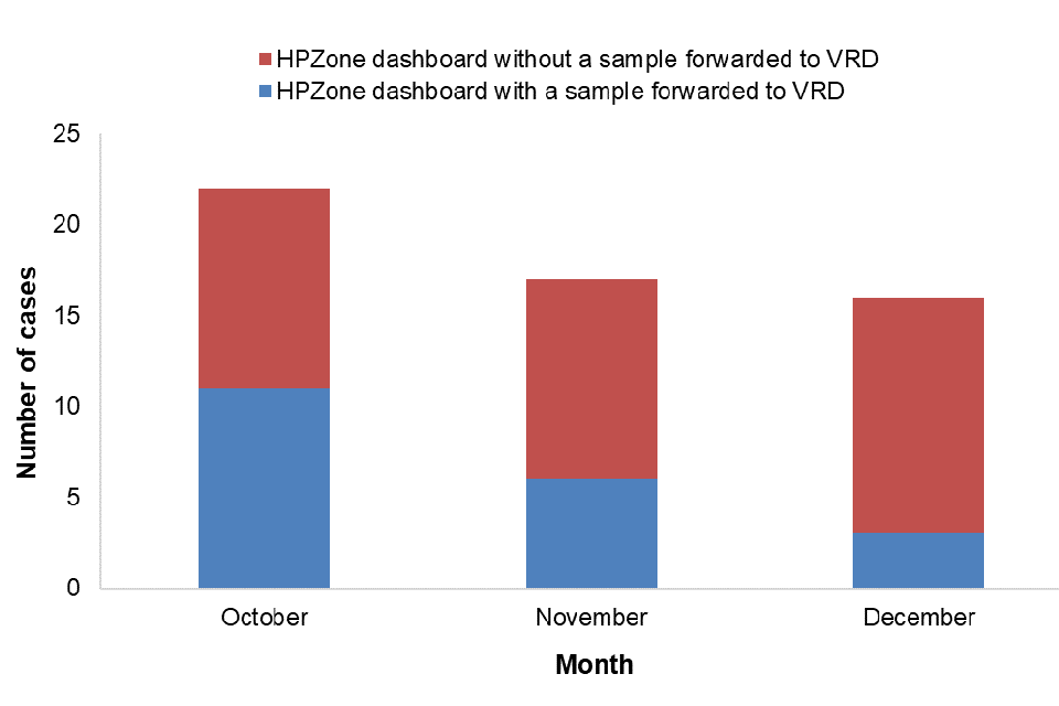 Figure 2. October to December 2023 cases by month entered onto HPZone with or without a sample forwarded to VRD for avidity and molecular characterisation