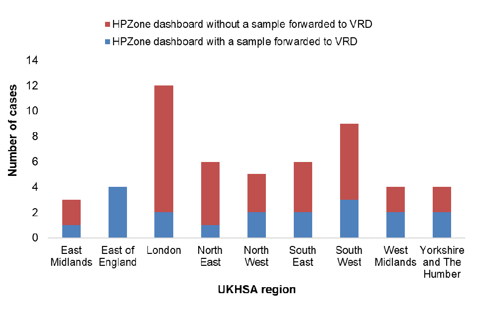 Figure 3. October to December 2023 cases by UKHSA region entered onto HPZone with or without a sample forwarded to VRD for avidity and molecular characterisation