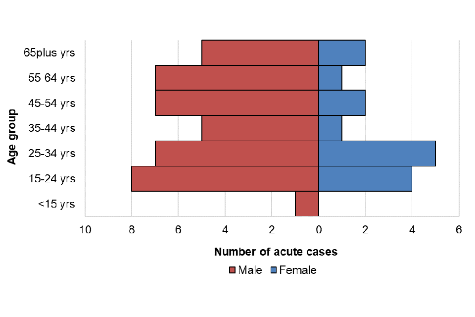 For cases entered onto HPZone between October and December 2023, age and sex was reported for all cases. Where sex was known, males accounted for 73% of cases (40 out of 55) and females 27% (15 out of 55). The median age of persons with acute HBV infection was 39 years old (IQR: 26 to 57): 43 (IQR: 26 to 57) for males and 32 (IQR: 24 to 51) for females. The age distribution by sex is presented in figure 4; the highest proportion of cases was seen in the 15 to 24 and 25 to 34 year age groups, followed by the 45 to 54 year age group. The highest proportion in males was seen in the 15 to 24 year age group and, in females, the 25 to 34 year age group. Where reported, 58% (26/45) of persons with acute HBV were resident in the two most deprived quintles. Where ethnicity was available (31, 56%), 48% (15) of those with acute HBV infection were of white British ethnic origin, followed by those of Asian or Asian British ethnic origin (19%; 6) and black or black British ethnic origin (16%; 5).