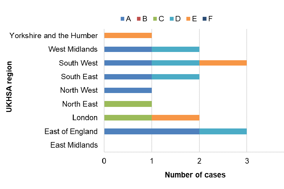 All 15 of the confirmed acute cases were genotyped during October to December 2023; the distribution of genotypes is shown in table 1. The distribution of genotypes seen in UKHSA regions is shown in figure 5.