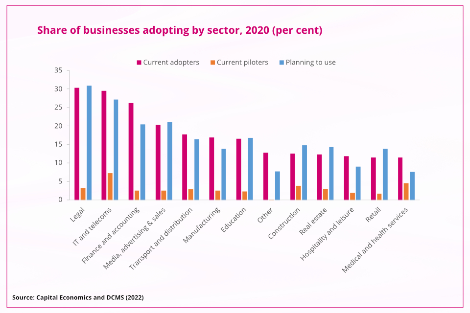 The IT and telecommunications (29.5%) and legal (29.2%) sectors currently have the highest rate of adoption, while the sectors with the lowest adoption rates are hospitality (11.9%), health (11.5%), and retail (11.5%).