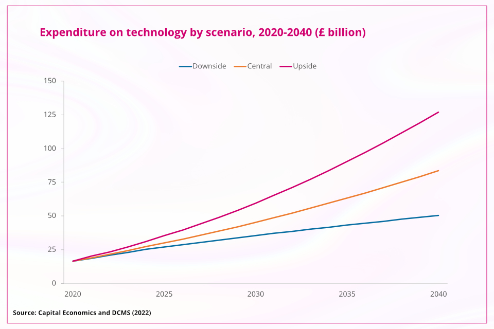 In the downside scenario, AI technology expenditure increases to £50.4 billion by 2040 at an annual growth rate of 5.7% and in the upside scenario it increases to £127 billion at an annual growth rate of 10.7%.