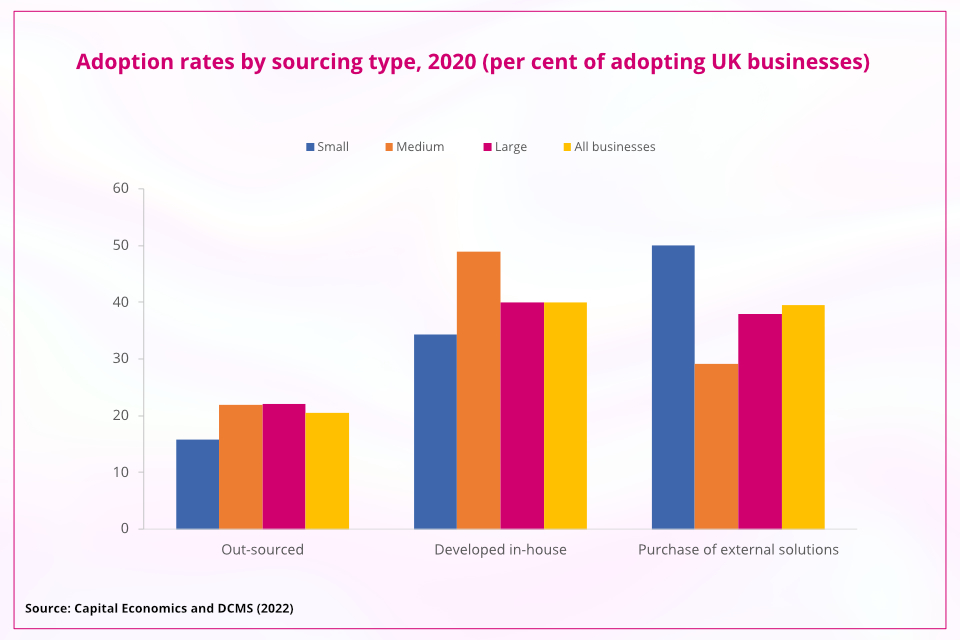 Medium sized firms were the most likely to develop AI solutions in-house. Around 49% of these firms did this compared to 40% of large firms and 34% of small firms.