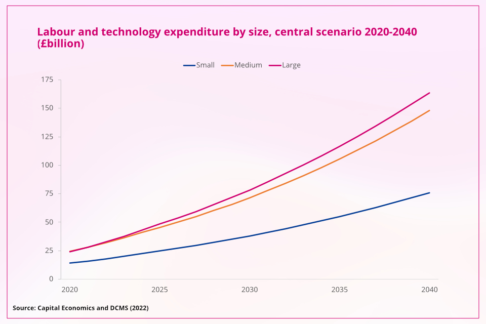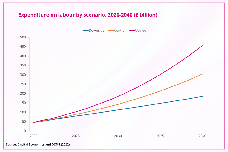 In the downside scenario, AI labour expenditure increases to £185.2 billion by 2040 at an annual growth rate of 7.2% and in the upside scenario it increases to £456.0 billion at an annual growth rate of 12.1%.