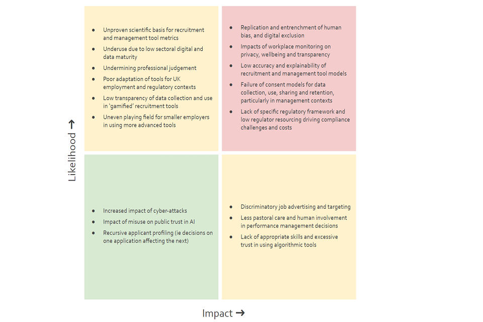 Cyberattacks can present additional risks due to the use of data-driven technologies, but these were considered to be lower than in some other sectors by our panel. In part this was because use cases in this sector tend not to be in safety or time-critical processes, or do not necessarily involve the additional collection and storage of sensitive personal data significantly beyond the considerable volumes normally collected for recruitment and management purposes. However, the impacts of data breaches and changes in algorithmic decision-making functionality could still result in considerable harms for individuals and organisations.