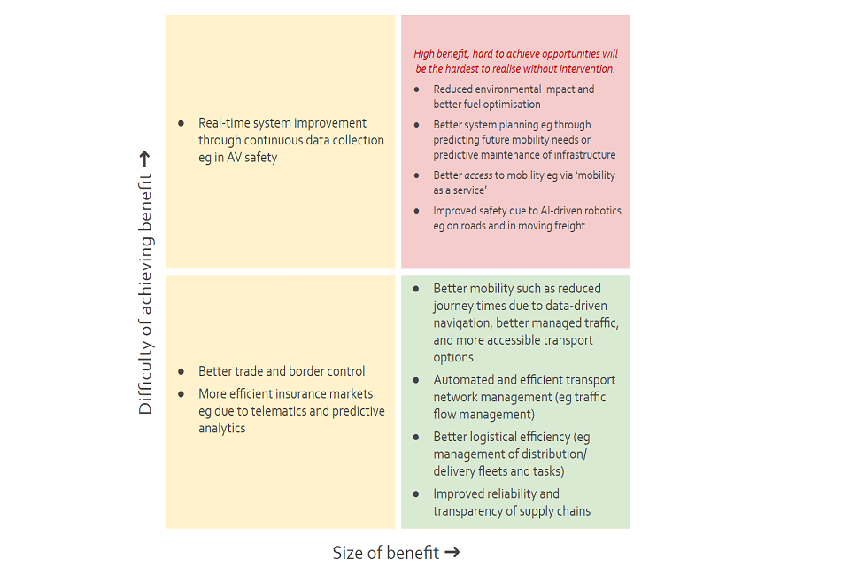 The biggest opportunities are at system-level: Many of the most significant benefits of data-driven technology will only be felt in this sector when implemented on a system wide basis, requiring significant investment and time. For example, the use of automated traffic management systems would require sizeable changes to existing technology and operating procedures. Similarly, realising some of the efficiencies of autonomous vehicles, such as optimised driving approaches, may depend on a sufficient proportion of all road vehicles being autonomous.
