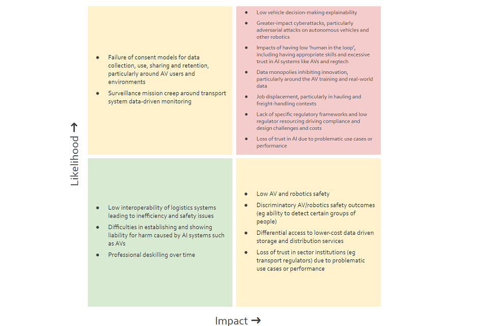 Safety risks were understandably among the highest-impact risks identified by our panel, with contributing factors such as low explainability, and appropriate integration of human decision-making into automated systems also ranking highly. Generally, our panel were more concerned about the use of robotics by autonomous road vehicles than in more controlled or predictable environments such as rail or ports, and noted the difficulty in safely achieving higher levels of road vehicle automation, particularly in hybrid contexts (ie around human drivers). The increasing integration of different digital systems can give rise to emergent interdependencies and risks, and our panel noted the particular impact that problematic performance of data-driven technology in this sector might have on public trust in AI technologies generally, due to the emblematic nature of use cases such as autonomous vehicles. This could be exacerbated by real or perceived bias in safety outcomes (for example, with autonomous vehicles being less capable of detecting some groups, such as wheelchair users).