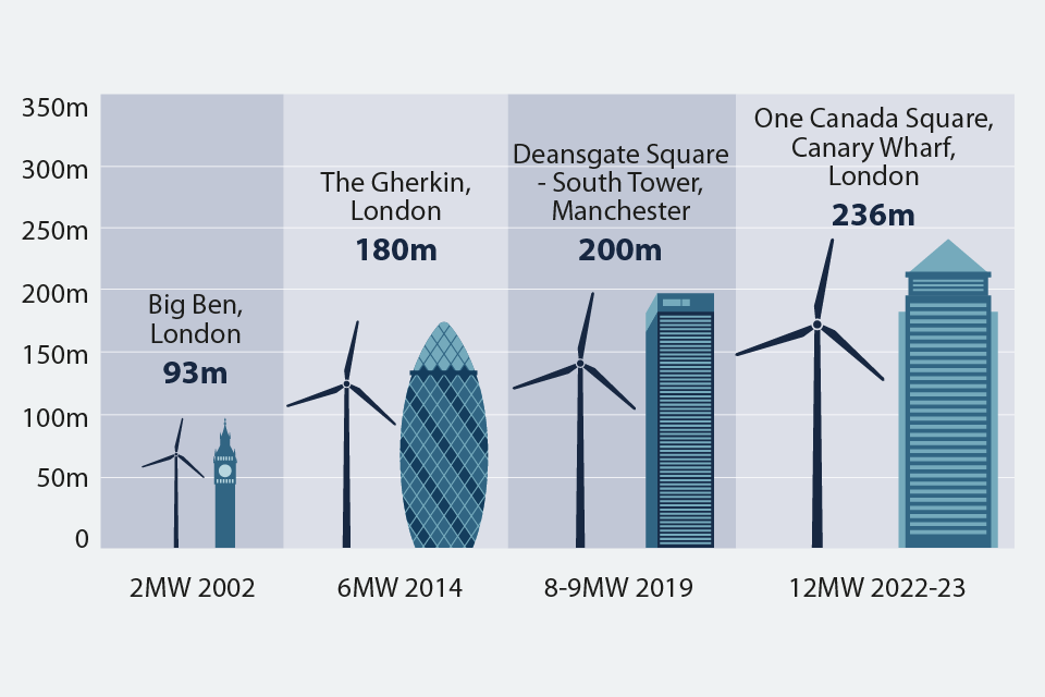 Comparison of offshore wind turbine size over time. From 2002 (2MW, 93m) to 2022-23 (12MW, 236m).