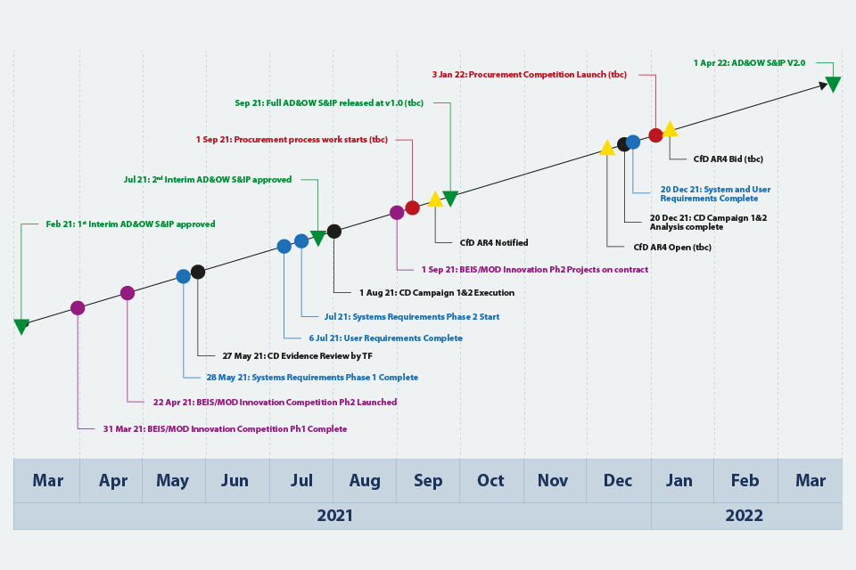 - 2020 - 2025: Implementation of next rounds of Offshore Wind developments to meet 40GW by 2030. The immediate imperative is that a strategy is agreed to set the conditions for bidding in CfD AR4 [footnote 1] such that windfarm developers and the MOD can each have confidence that mitigation plans will meet the relevant consent conditions in order to initiate construction and thus enable turbine operation from no earlier than Q2 2025 with a central scenario of Q4 2025[footnote 2] . The Contracts for Difference (CfD) scheme is the Government’s main mechanism for supporting low-carbon energy generation by incentivising developer investment. The fourth round of the CfD scheme – to open in late 2021 – will aim to double the capacity of renewable energy compared to the last round and expand the number of technologies supported, with offshore wind, onshore wind, solar, tidal and floating offshore wind projects all eligible to bid.