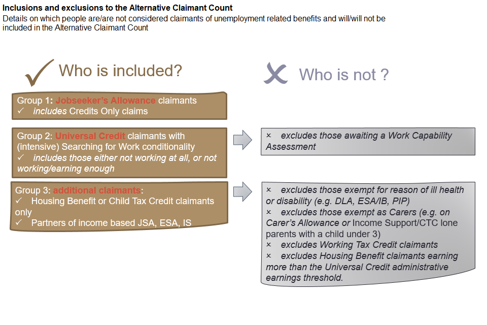 In certain circumstances it may be possible to work and claim unemployment related benefits. These are generally claimants working part time or with very low earnings. Within the Alternative Claimant Count, the employment status of a claimant is derived depending on which group the claimant is in.