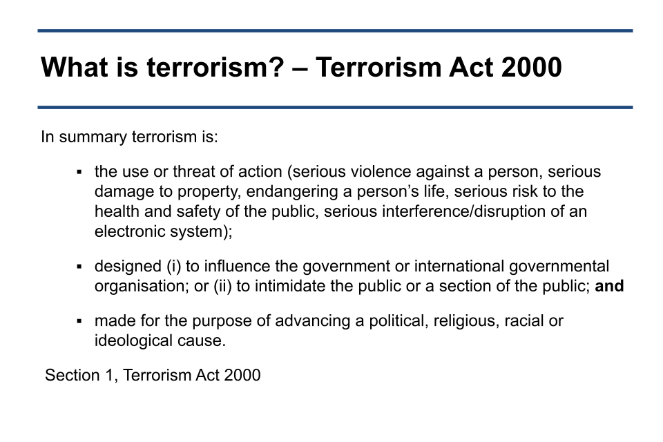 Image of slide 5: What is terrorism? Terrorism Act 2000