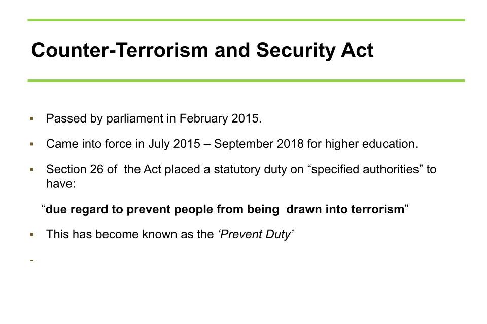 This slide covers some brief details on the passage of the Act – drawing attention to section 26 which made it statutory for a number of specified authorities to engage with the Prevent Duty.
