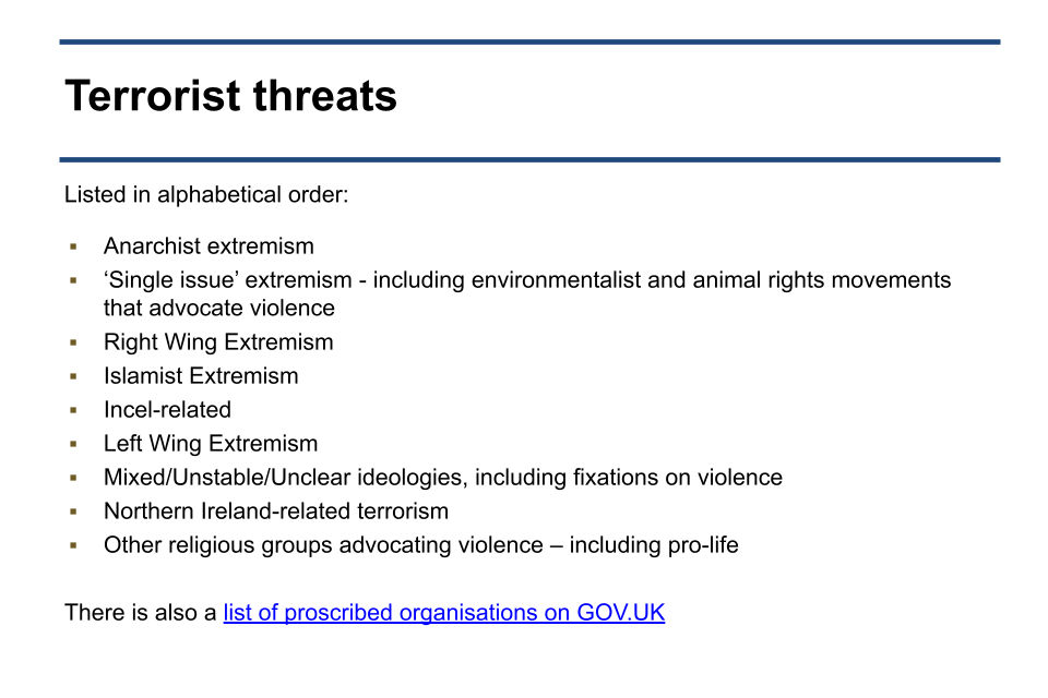 Some groups and organisations are proscribed, which means that they are banned under counter-terrorism measures introduced under the Terrorism Act 2000 (for example, Da’esh and National Action).