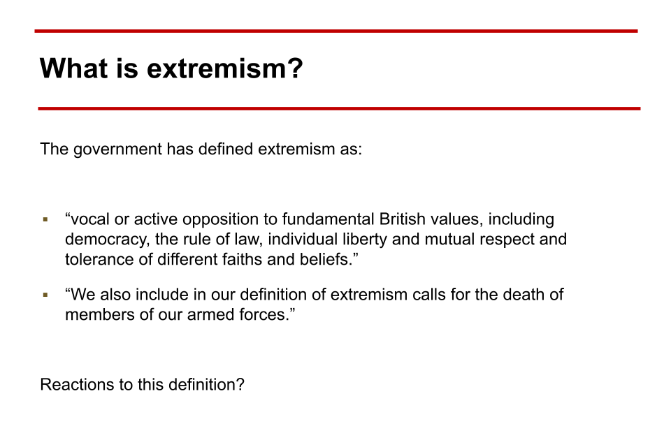 Here is the government definition – ask for reactions. It is highly likely that participants will question whether the values are “fundamentally British” – these are values to which many societies subscribe. These are values which are consistent with the mission, vision and value statements of many providers.