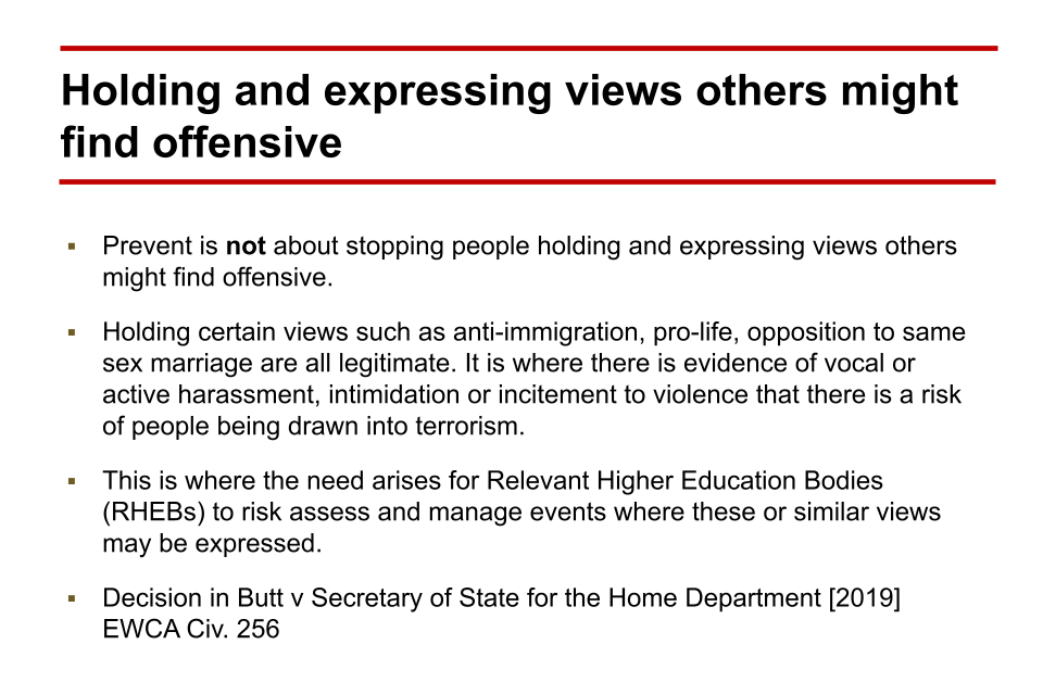 Please note that paragraph 11 of the Prevent HE guidance, which talks about balancing and mitigating risks, was subject to a judicial review decision in March 2019 - Butt v Secretary of State for the Home Department [2019] EWCA Civ. 256.