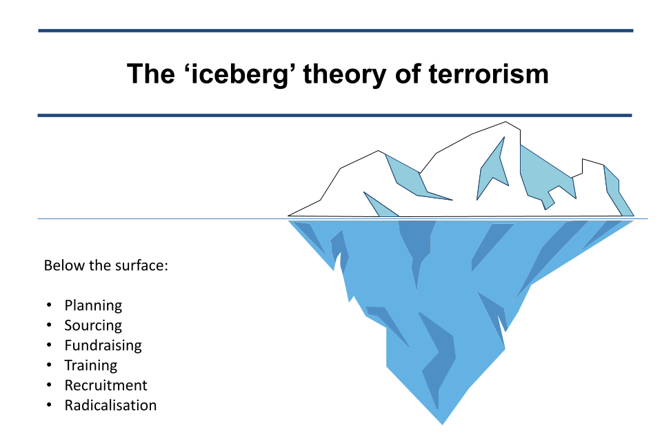This is a popular and widely held theory – that terrorism or an act of terrorism is only the tip of an iceberg. An iceberg has only 10% of its total mass above the water and the analogy is that underneath (or, on a timeline, before) the actual terrorist attack there is a great deal going on.