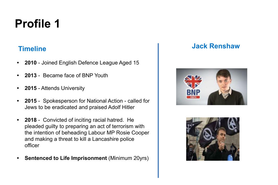 Anti-Semitic Facebook posts encouraging violence against Jewish people were reported by a student recruitment officer to their line manager. A concern was raised and formally reported to senior management. An open source and social media check was carried out on Renshaw, which resulted in a student case hearing being scheduled. Renshaw withdrew from his course and went on to speak at far-right events, calling for Jews to be eradicated.