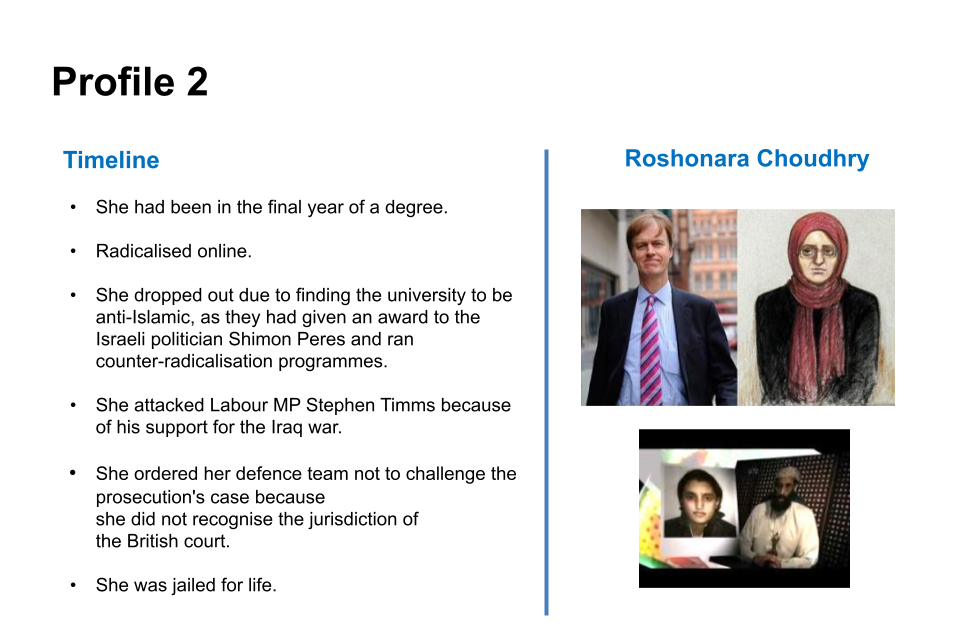 In May 2010, Roshonara Choudhry attempted to murder ex-Labour MP Stephen Timms because he had voted for the Iraq war. She dropped out of university in her third year having been a high-achieving student. She was radicalised online, and her family were as surprised as anyone by her actions. What we do know is that she retreated to her room for long periods because of domestic violence within the home.