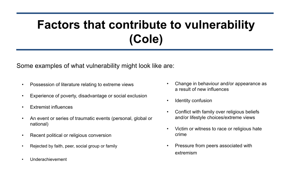 In the case of identifying someone who is vulnerable to being drawn into terrorism, this is relatively straightforward if there are overt signs, such as displaying certain emblems or expressing vocal support for known terrorist acts or proponents of terrorism. However, it is often the case that individuals will have been radicalised through influences outside the institution and may not exhibit behaviours that cause a concern.