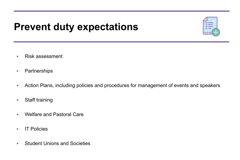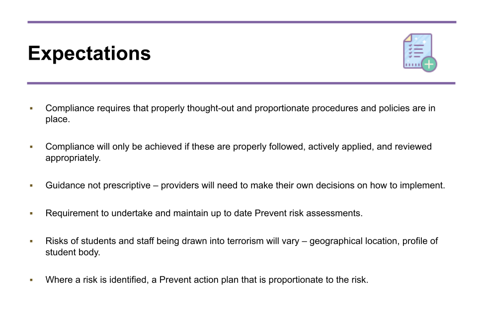 Emphasise that it isn’t only having policies in place; they will need to be actively applied and reviewed appropriately with clear evidence in place to demonstrate this. The other key point here is that risk assessments on the Prevent Duty must be undertaken and kept up to date – the level of risk will vary between providers, but the guidance emphasises that no provider is risk-free.