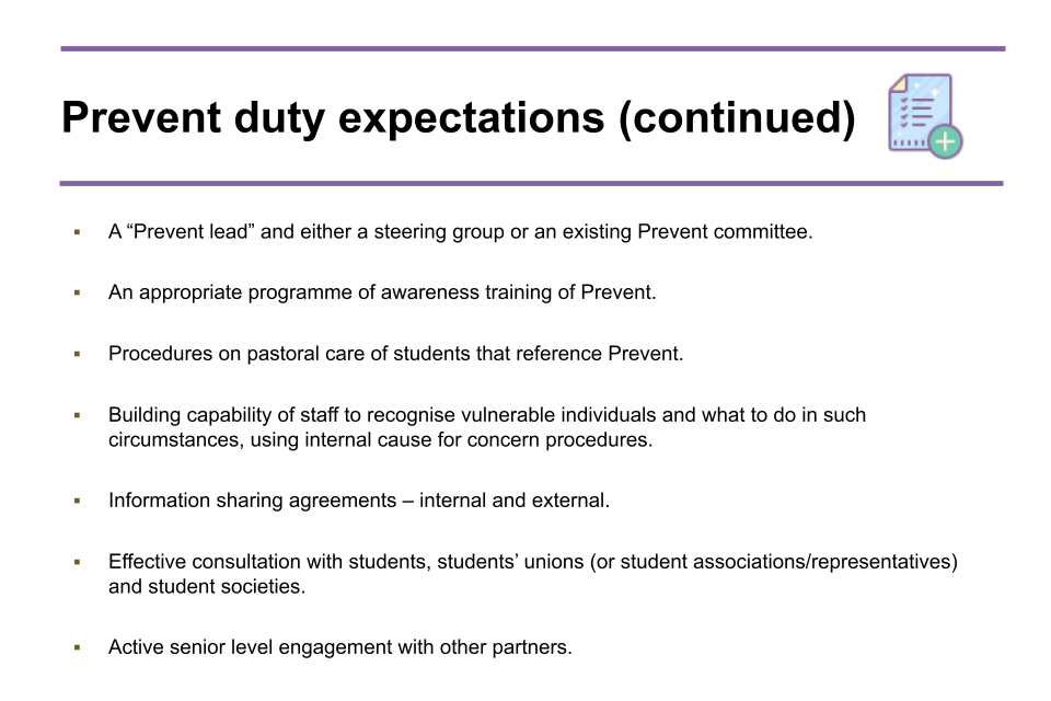 The Prevent Duty guidance extends this requirement to providers not mentioned in these Acts – predominantly the ‘small and specialist providers’. We should note that there is no precise definition of ‘external speakers’ but there is an expectation that the policies should apply to all staff, students and visitors and clearly set out what is required for any event to proceed.