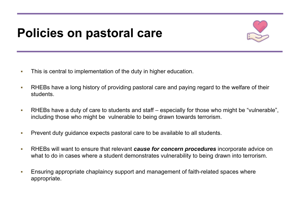 This is central to the Duty. Universities and colleges take seriously their duty of care to their students and to their staff. They have in place a range of support services, especially to support students identified as vulnerable. The Prevent Duty requires that such arrangements include support for students vulnerable to being drawn into terrorism. Cause for concern procedures should acknowledge this.