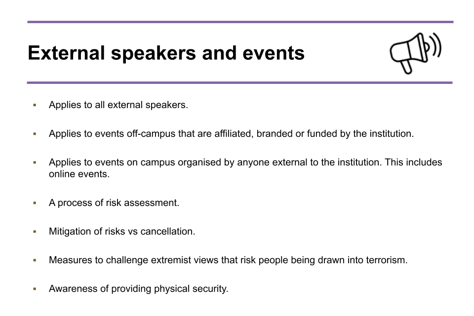 Policies should also cover online events where no speaker is actually present and off-campus events that are branded or affiliated to the university or Students’ Union, as well as the commercial use of premises by external groups.