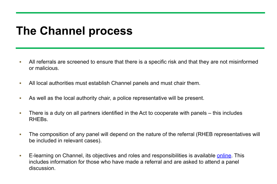 Channel is the responsibility of the local authority. All parties subject to the Prevent duty must cooperate with the process. Where appropriate, the RHEB will be represented on a Channel panel.