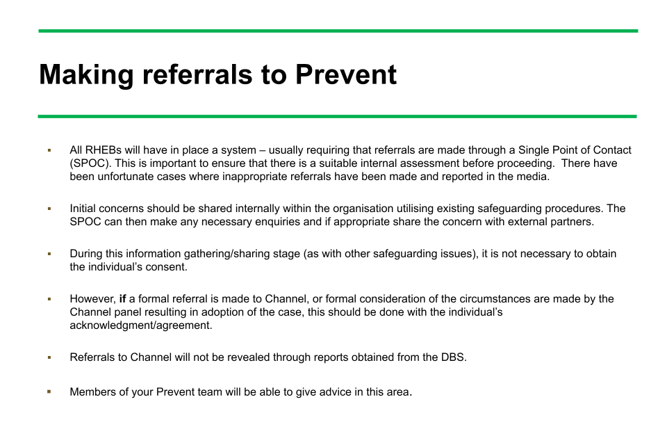 If a formal referral is made to Prevent, it is good practice to do so with the individual’s acknowledgment or agreement. Referrals to Prevent should not be made directly by any member of staff or individual within a provider other than the Prevent Lead or Designated Safeguarding Lead.