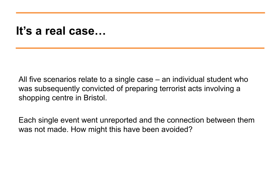 All these incidents (as indicated on slide 31) relate to a single individual who was subsequently convicted of preparing terrorist acts involving a shopping centre in Bristol. He was a student at the City of Bristol College at the time of his arrest. The incidents and any concerns associated with them were not reported and therefore, no connection between them was made.