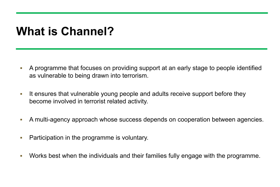 Channel is an important part of Prevent. It’s aim is early intervention to provide support to vulnerable individuals
