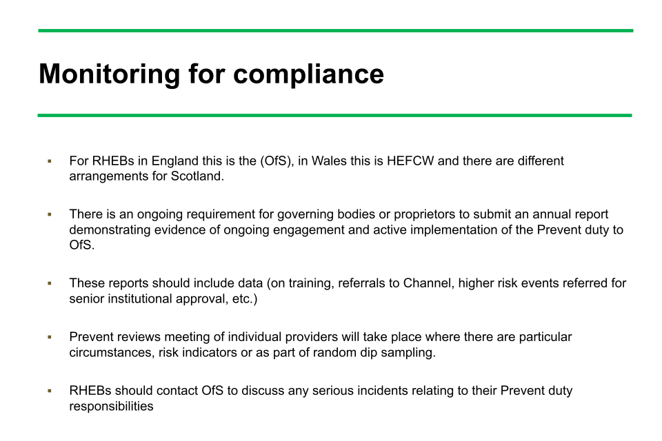 For RHEBs in England the monitoring body is the OfS. In Wales, the monitoring body is Higher Education Funding Council Wales (HEFCW). In cases where there are particular circumstances or risk factors at an individual provider, a Prevent review involving face-to-face meetings may take place.