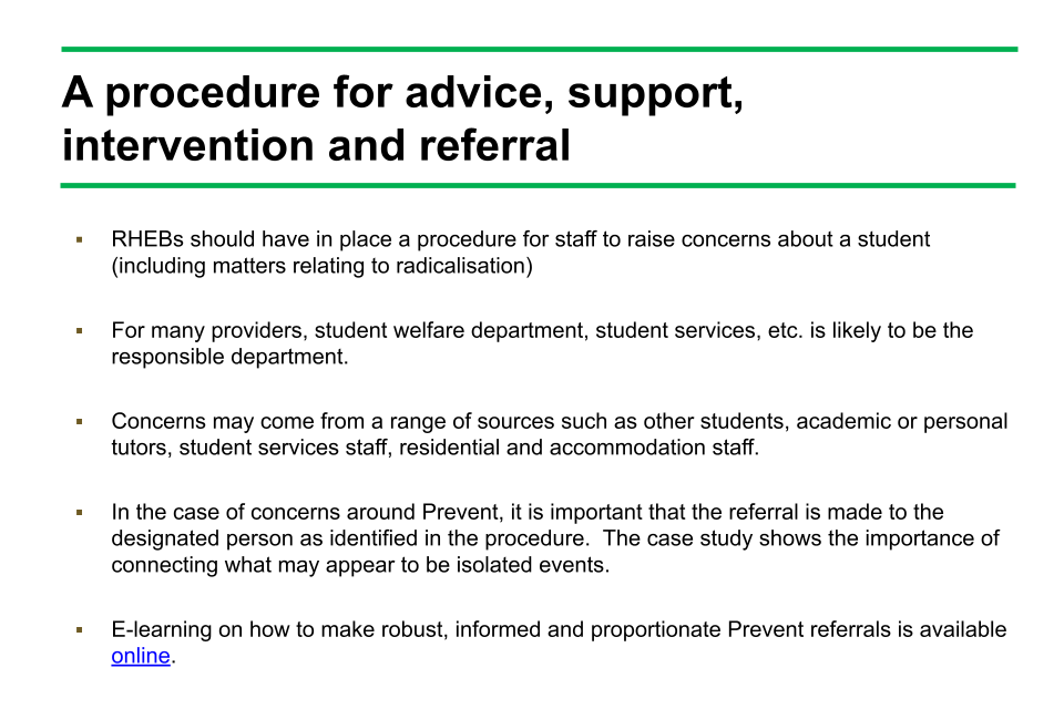 The trainer may wish to ascertain at this point how many delegates are aware of their own providers cause for concern’ policy or process and set this out in detail, including who is responsible for assessing whether a Prevent referral is required.