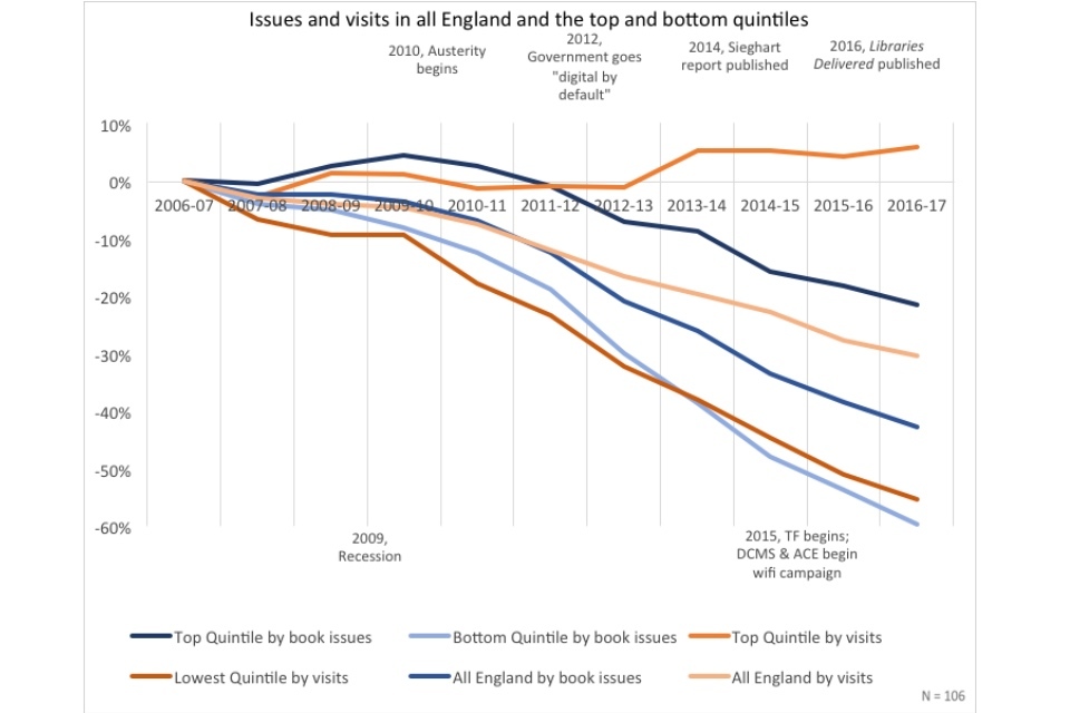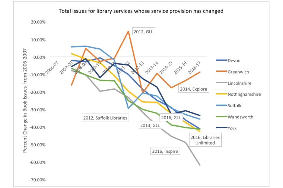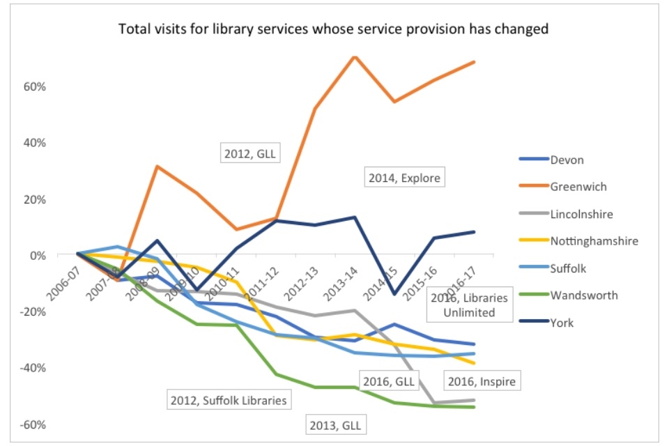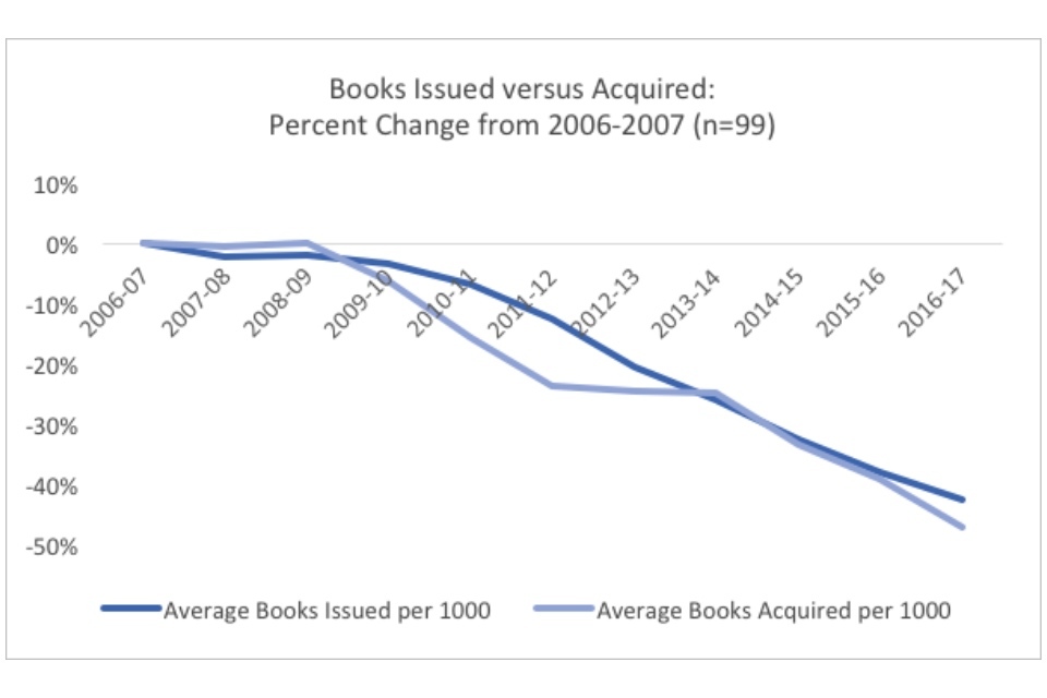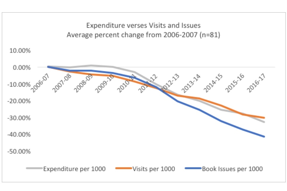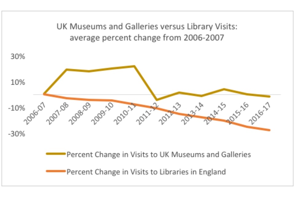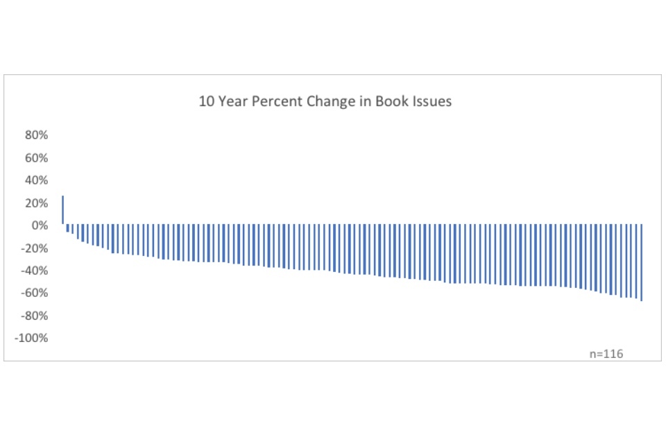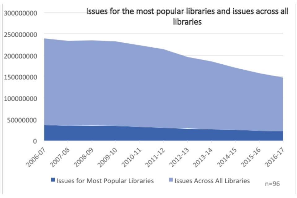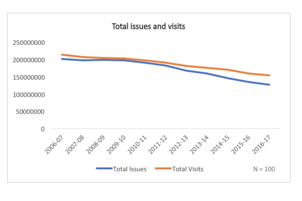 The dominant narrative surrounding English public libraries is one of decline. Issues are down, visits are down, and libraries are closing, cutting hours, and replacing staff with volunteers. People have posited a number of root causes for the decline: cuts due to austerity, supposed mismanagement or apathy, the shift to digital and the general collapse of reading across the national.