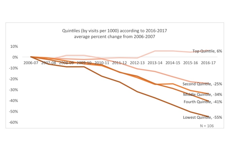 Line graph showing quintiles (by visits per 1000) according to 2016-2017 average percent change from 2006-2007