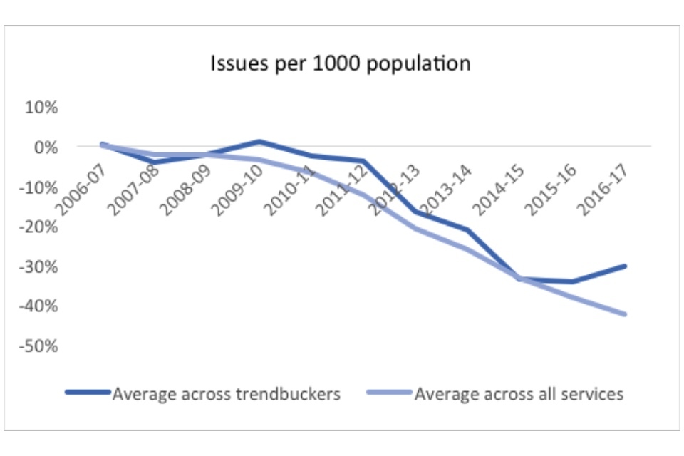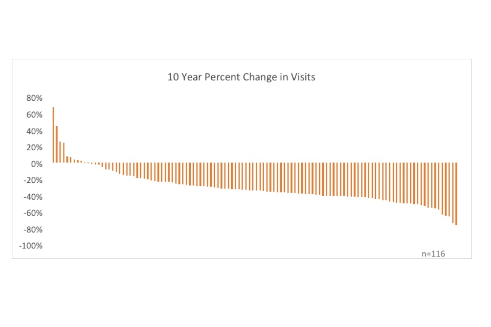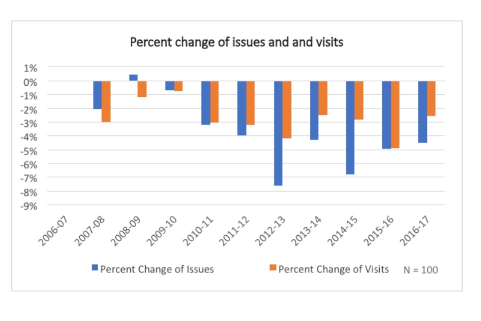 Although the trend is downward, the narrative is not entirely negative. Issues and visits are still declining, but are doing so less rapidly, and declines may continue to slow in future years. In 2016-2017, issues and visits declined by 4% and 3%, relative to 2006-2007 figures, compared to all-time maximum decreases of 8% and 4% respectively.