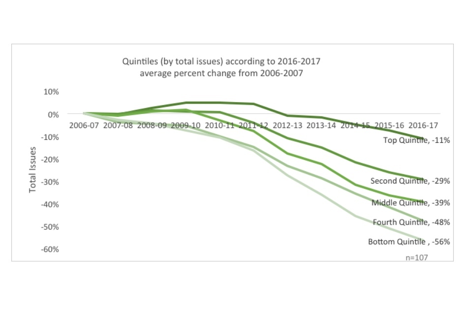Line graph showing quintiles quintiles (by total issues) according to 2016-2017 average percent change from 2006-2007