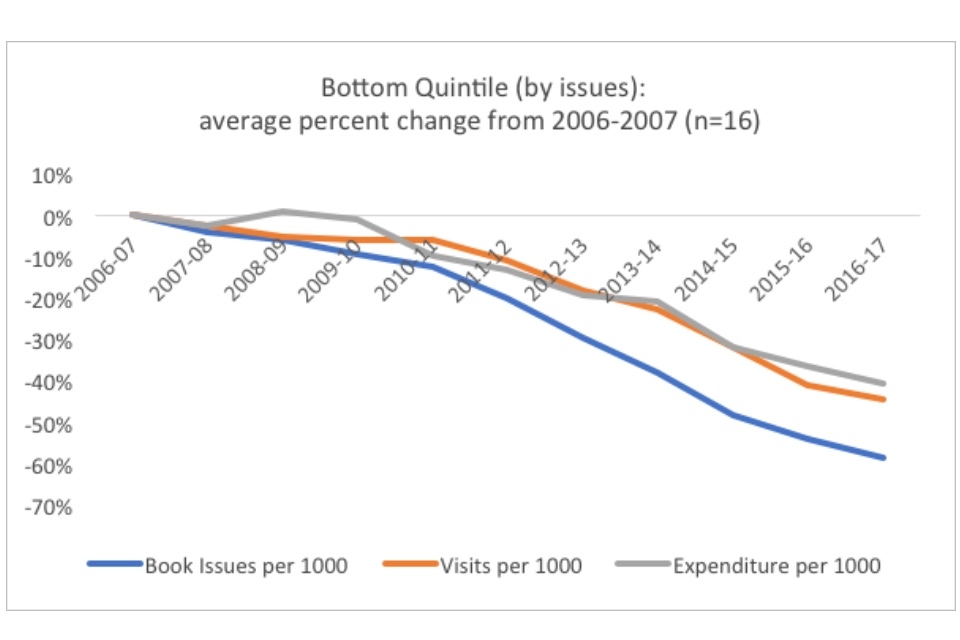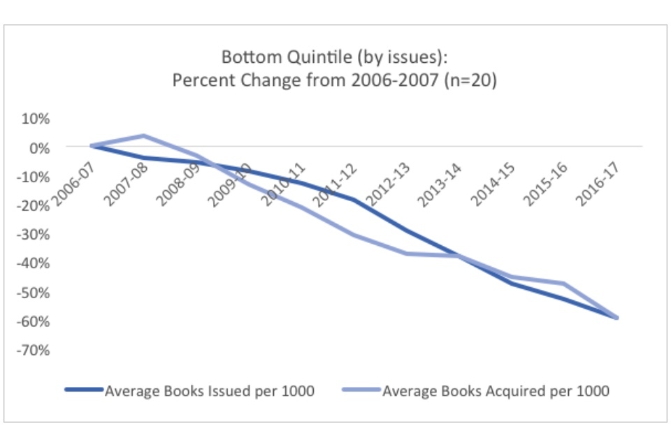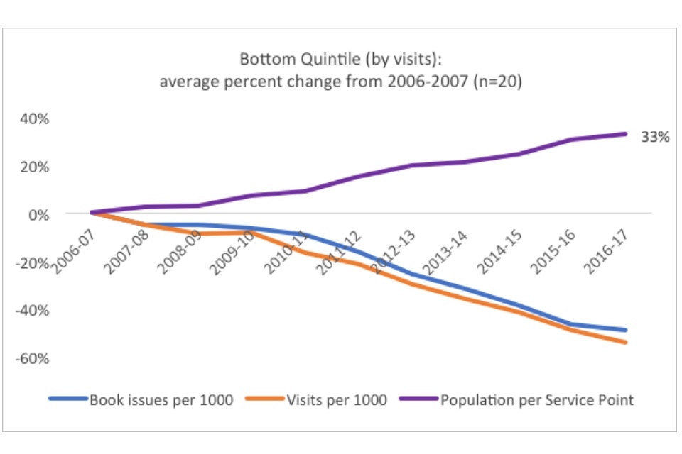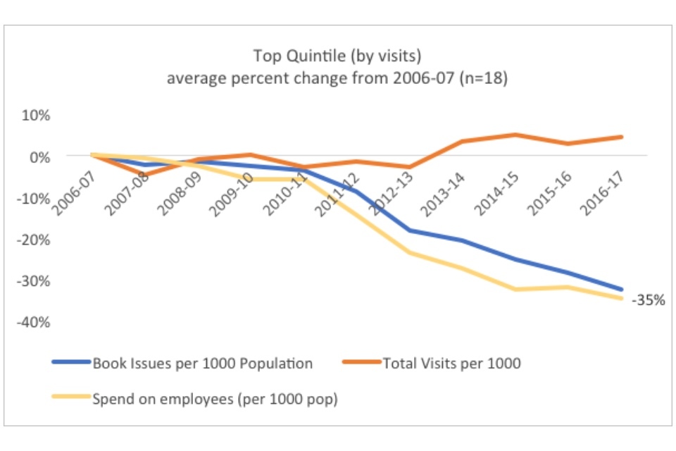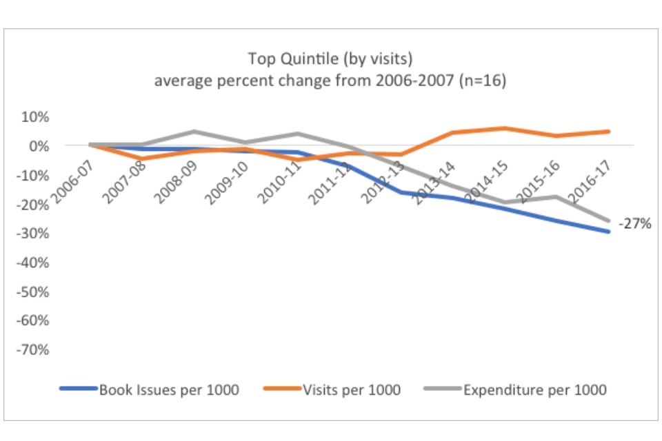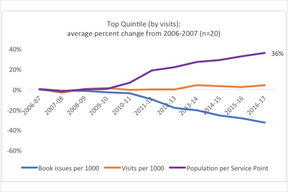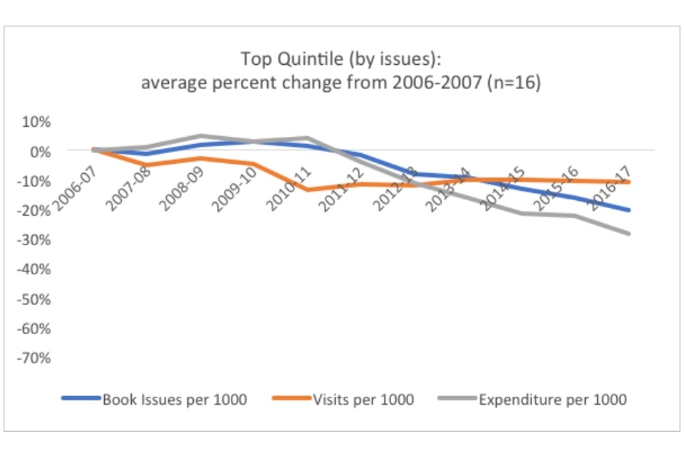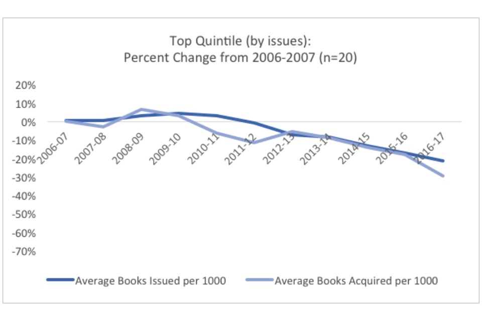 Within the context of the overall dramatic declines in both visits and book issues, the existence of well-performing quintiles indicate that in some cases library services have found ways to buck the national trends. Especially notable is the existence of a positive trend for the top quintile in visits. When this is compared to the fact that the best performing quintile in book issues have only decreased the trend of decline (22% versus 38% overall), rather than reversing it, the graphs may indicate that there has been a significant shift in the way people use their library services.