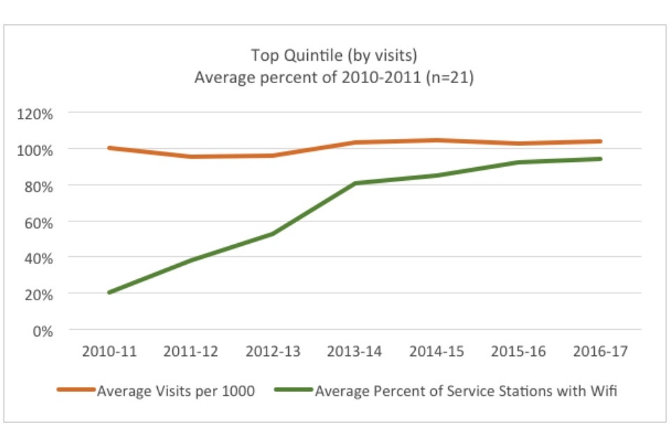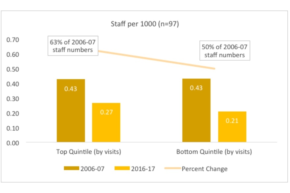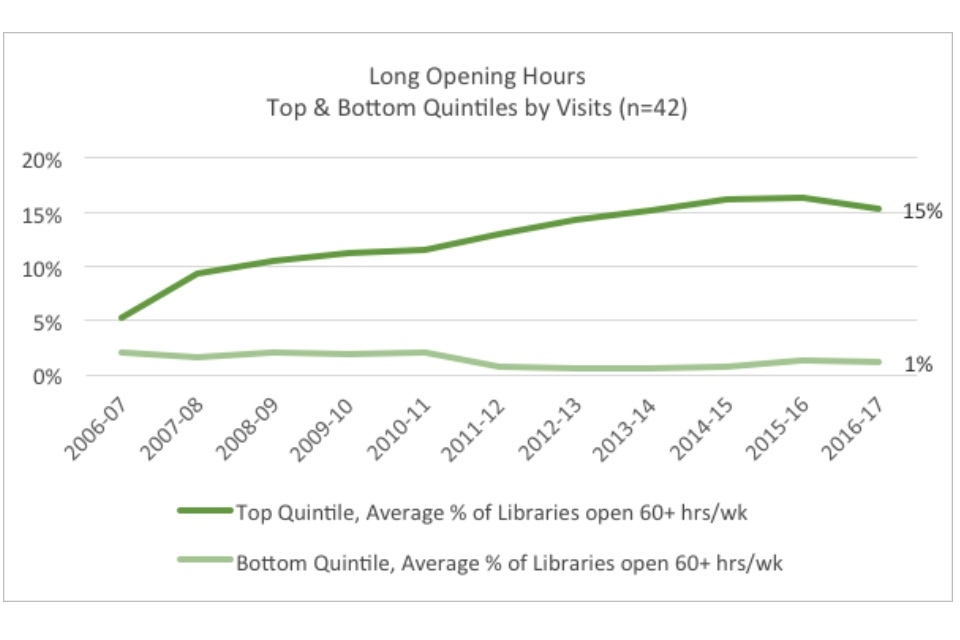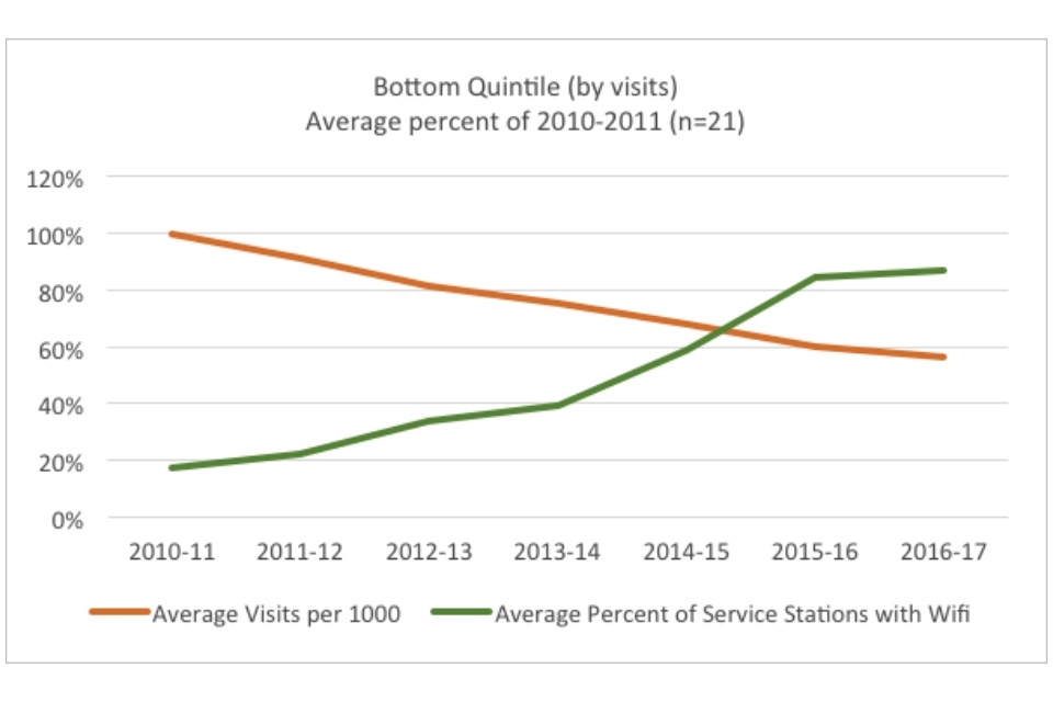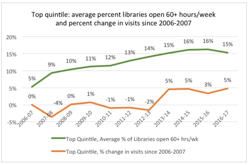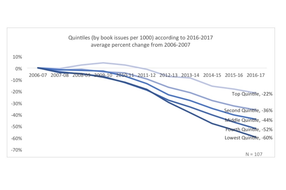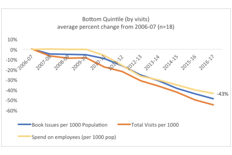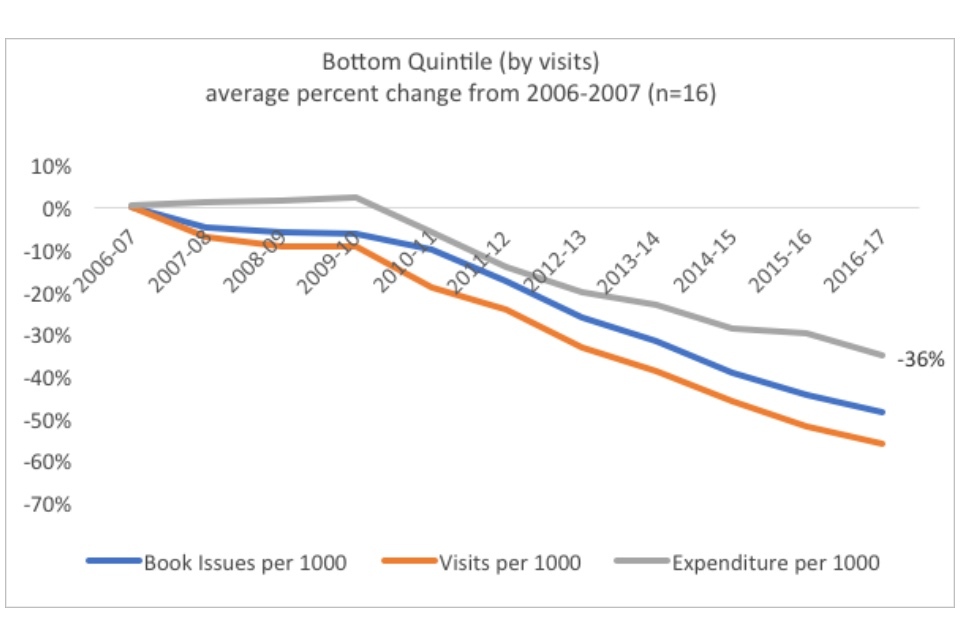 Within the context of the overall dramatic declines in both visits and book issues, the existence of well-performing quintiles indicate that in some cases library services have found ways to buck the national trends. Especially notable is the existence of a positive trend for the top quintile in visits. When this is compared to the fact that the best performing quintile in book issues have only decreased the trend of decline (22% versus 38% overall), rather than reversing it, the graphs may indicate that there has been a significant shift in the way people use their library services.