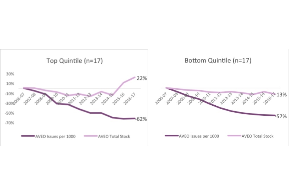 Line graph showing quintiles (by issues per 1000) according to 2016-2017 average percent change from 2006-2007