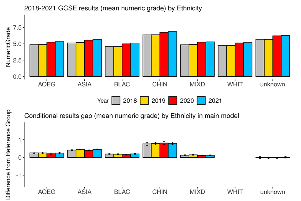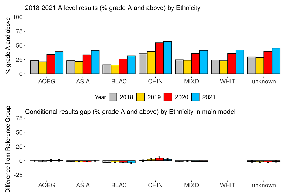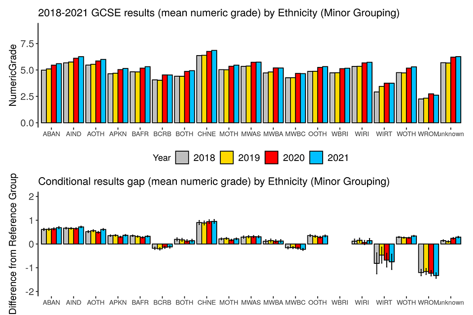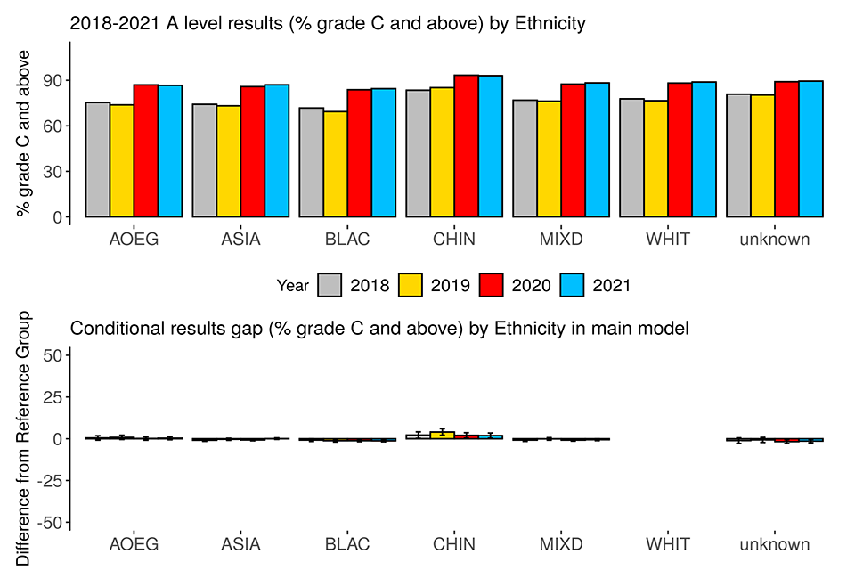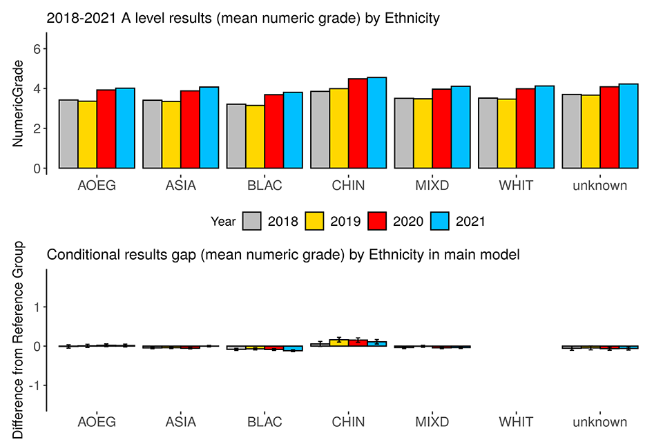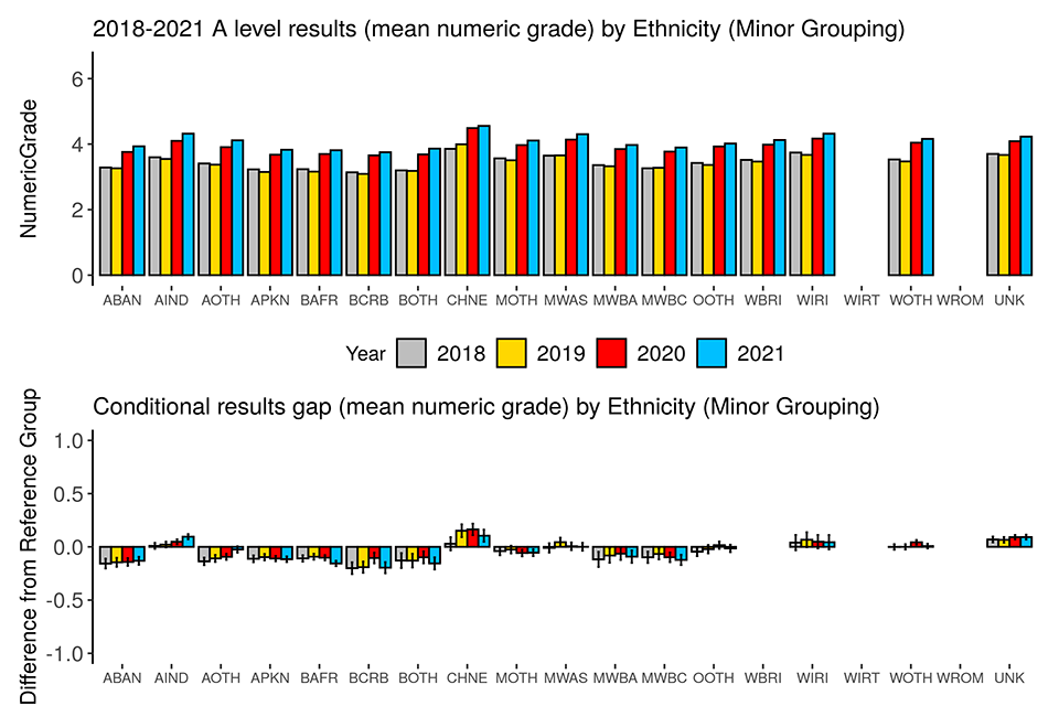 - the gap indicating higher outcomes of candidates with unknown ethnicity relative to prior-attainment-matched White British candidates has widened slightly by 0.19 grade