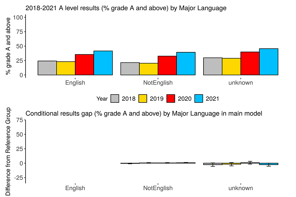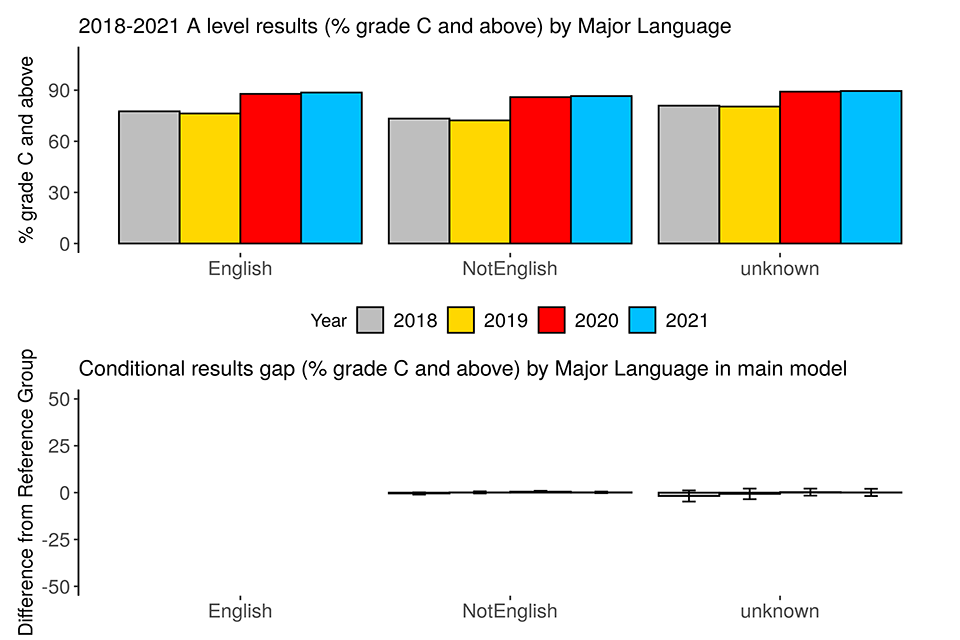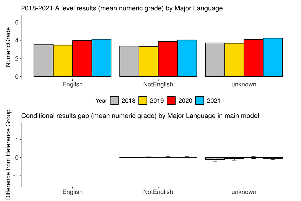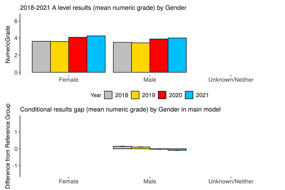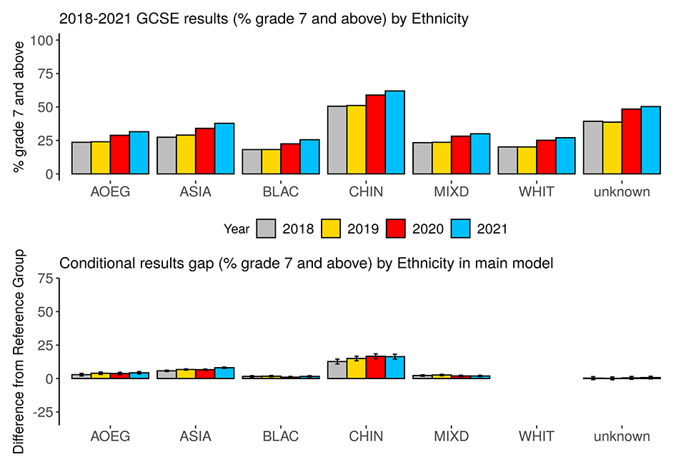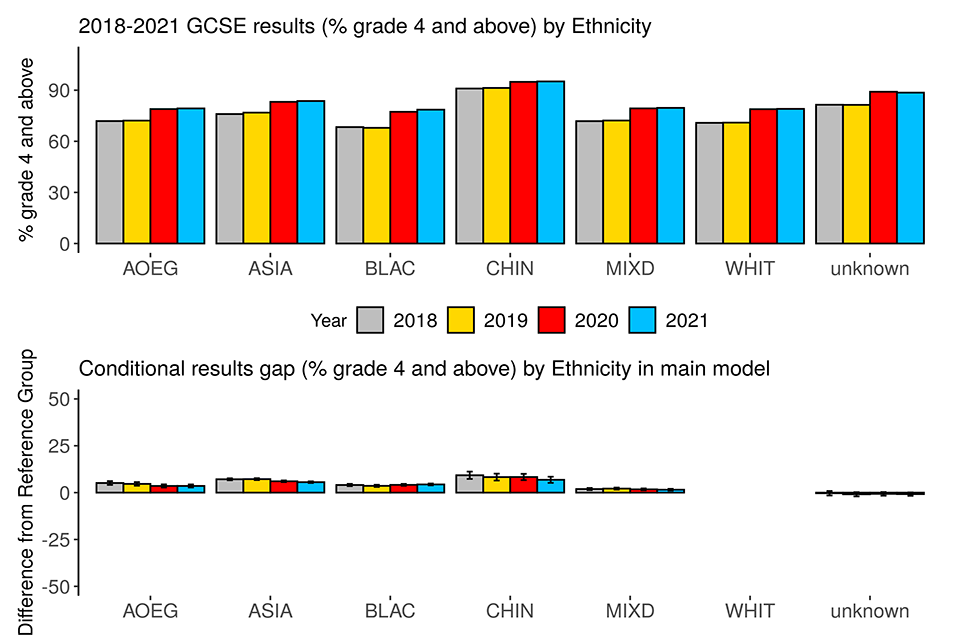 - the gap indicating higher outcomes of candidates with unknown ethnicity relative to prior-attainment-matched White British candidates has widened slightly by 0.19 grade