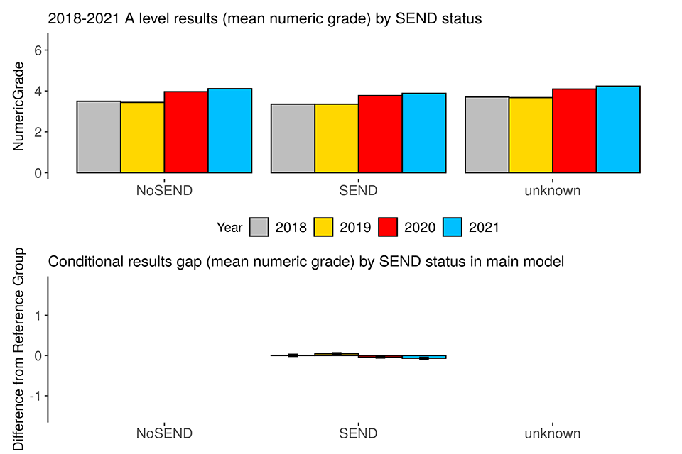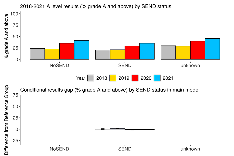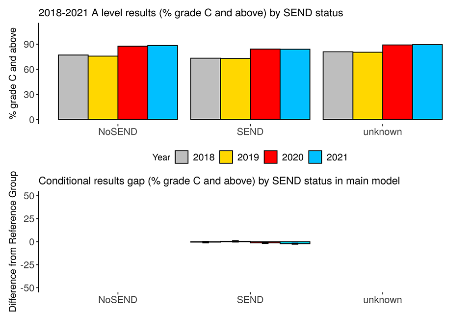Some groups showed notable changes from 2019 to 2021 on all 3 results measures. Male candidates, candidates with SEND, candidates in secondary selective schools, sixth form and tertiary colleges, have seen, from 2019 to 2021, a small decrease in outcomes (small changes not exceeding 0.2 grade) relative to prior-attainment-matched candidates of their respective comparator group, namely, female candidates, candidates without SEND, candidates in academies respectively.